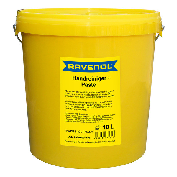 RAVENOL Handreiniger-Paste is a slightly yellowish paste, biodegradable, pH neutral, fresh-smelling wood flour-hand cleaner.